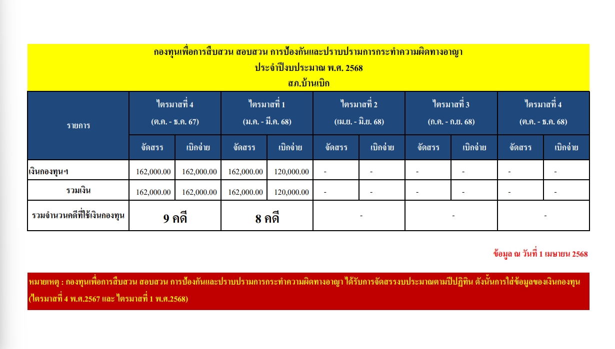สถานีตำรวจภูธรบ้านเบิก ได้แสดงข้อมูลเงินกองทุนเพื่อการสืบสวนสอบสวนการป้องกันและปราบปรามการกระทำผิดในคดีอาญาที่สถานีตำรวจภูธรบ้านเบิกได้รับการจัดสรรและการใช้จ่ายเงินกองทุน (ไตรมาสที่ 4 พ.ศ.2567 และ ไตรมาสที่ 1 พ.ศ.2568) มีดังรายละเอียดล่างนี้